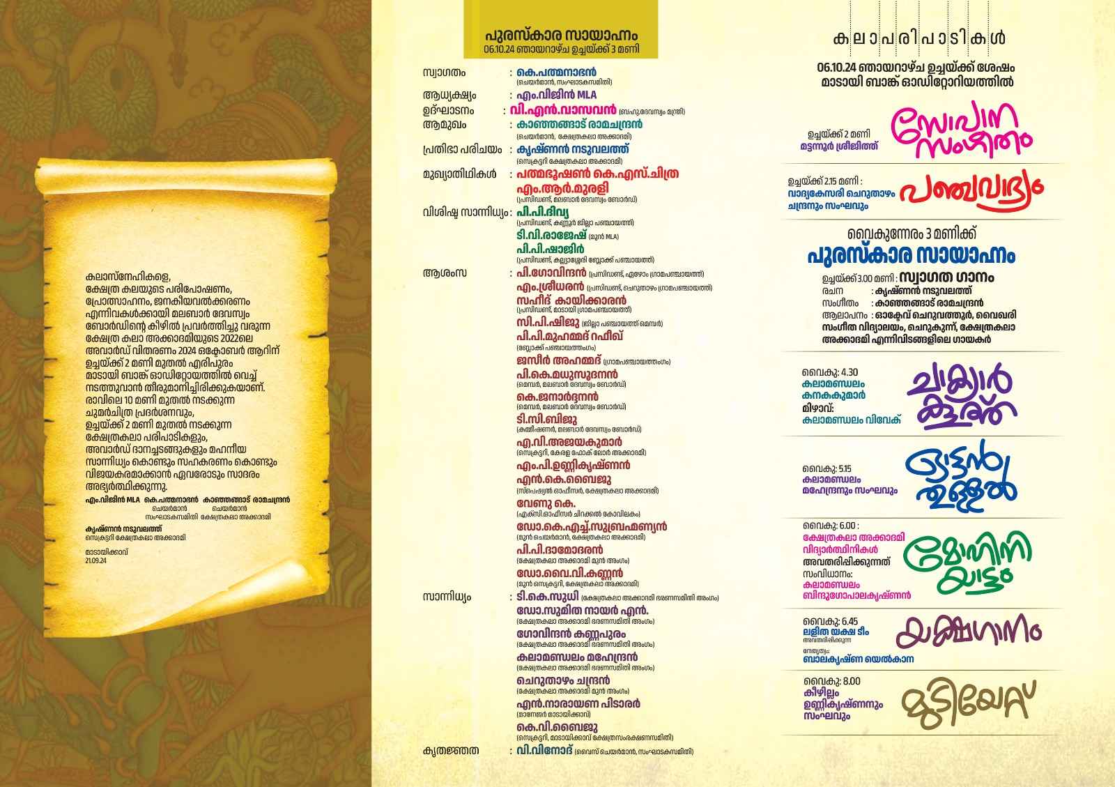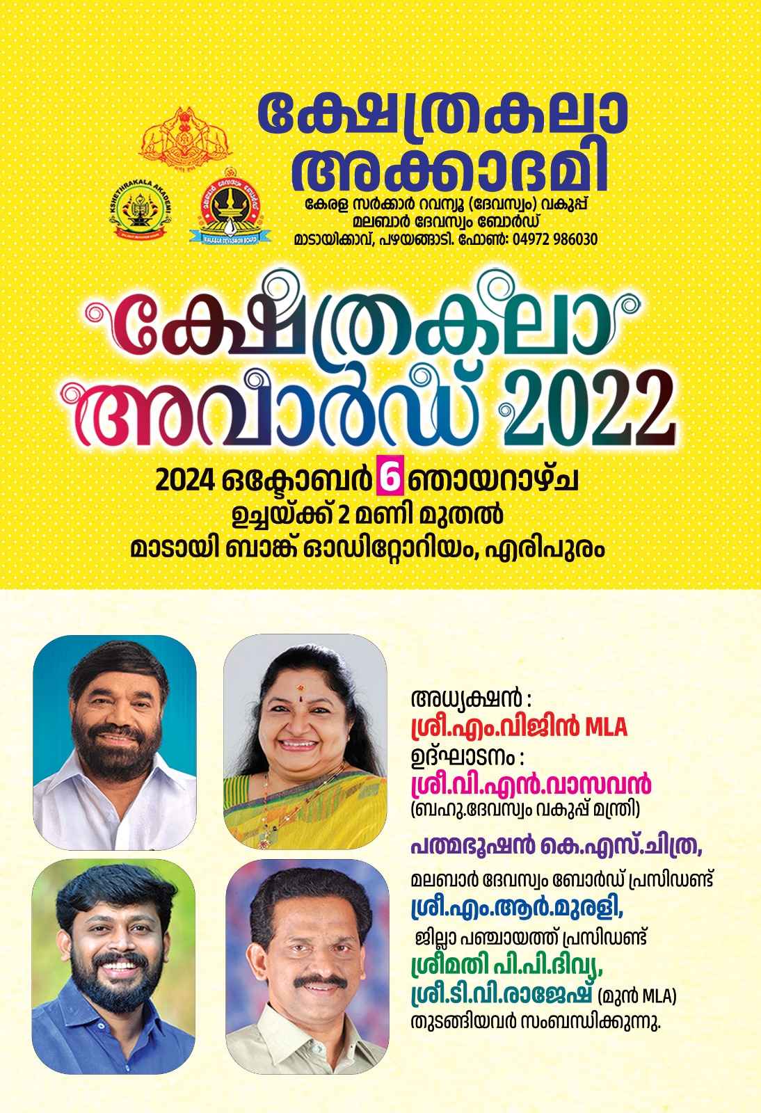 2024 ഒക്ടോബർ 6 ഞായറാഴ്ച ഉച്ചയ്ക്ക് 2 മണി മുതൽ മാടായി ബാങ്ക് ഓഡിറ്റോറിയം, എരിപുരം നടക്കും. കല്ലാശ്ശേരി എംഎൽഎ എം.വിജിൻ MLA അധ്യക്ഷത വഹിക്കുന്ന ചടങ്ങിൽ ദേവസ്വം വകുപ്പ് മന്ത്രി വി.എൻ. വാസവൻ ഉദ്ഘാടനം നിർവഹിക്കും. പത്മഭൂഷൻ കെ.എസ്.ചിത്ര, മലബാർ ദേവസ്വം ബോർഡ് പ്രസിഡണ്ട് എം.ആർ.മുരളി, ജില്ലാ പഞ്ചായത്ത് പ്രസിഡണ്ട് പി.പി.ദിവ്യ, ടി.വി.രാജേഷ് , ക്ഷേത്ര കലാ അക്കാദമി സെക്രട്ടറി കൃഷ്ണൻ നടുവലത്ത് തുടങ്ങിയവർ സംബന്ധിക്കും. പുരസ്കാര വിതരണവും ചാക്യാർകൂത്ത്, ഓട്ടൻതുള്ളൽ മോഹിനിയാട്ടം , യക്ഷഗാനം തുടങ്ങിയ കലകൾ അരങ്ങേറും.